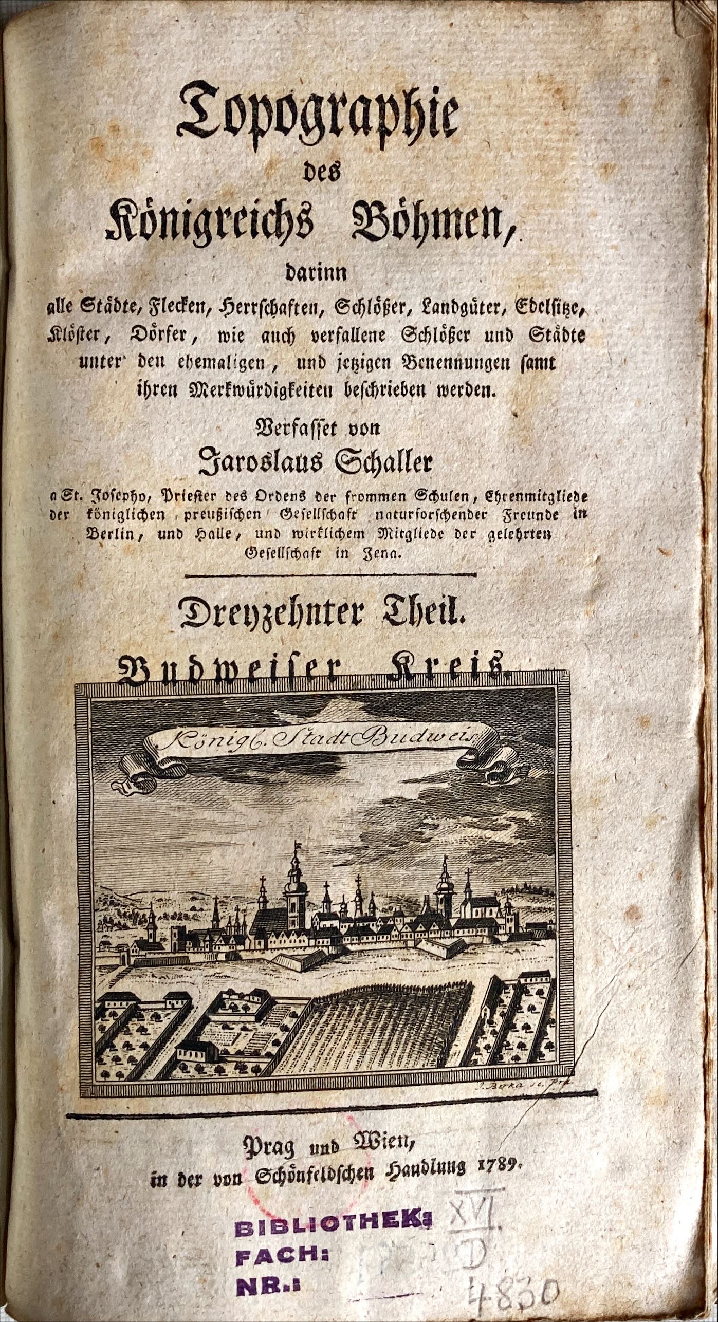 Záhlaví-jméno Schaller, Josef František Jaroslav, 1738-1809, (Autor) Údaje o názvu Topographie des Königreichs Böhmen : darinn alle Städte, Flecken, Herrschaften, Schlösser, Landgüter, Edelsitze, Klöster, Dörfer, wie auch verfallene Schlösser und Städte unter den ehemaligen und jetzigen Benennungen samt ihren Merkwürdigkeiten beschrieben werden. / Verfasset von Jaroslaus Schaller, a St. Josepho Priester des Ordens der frommen Schulen, Ehrenmitgliede de königlichen preußischen Gesellschaft naturfoschender Freunde in Berlin, und Halle, und wirklichem Mitgliede der gehrten Gesellschaft in Jena. Dreyzehnter Theil, Budweiser Kreis Dal.odpovědnost Berka, J. (Rytec)